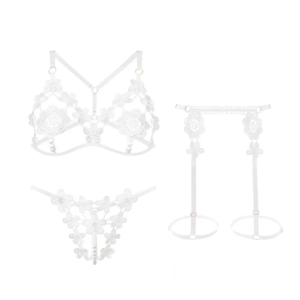 Indulge in seduction with this ravishing red lingerie adorned with luscious rose pearls, perfect for a romantic evening or special occasion.